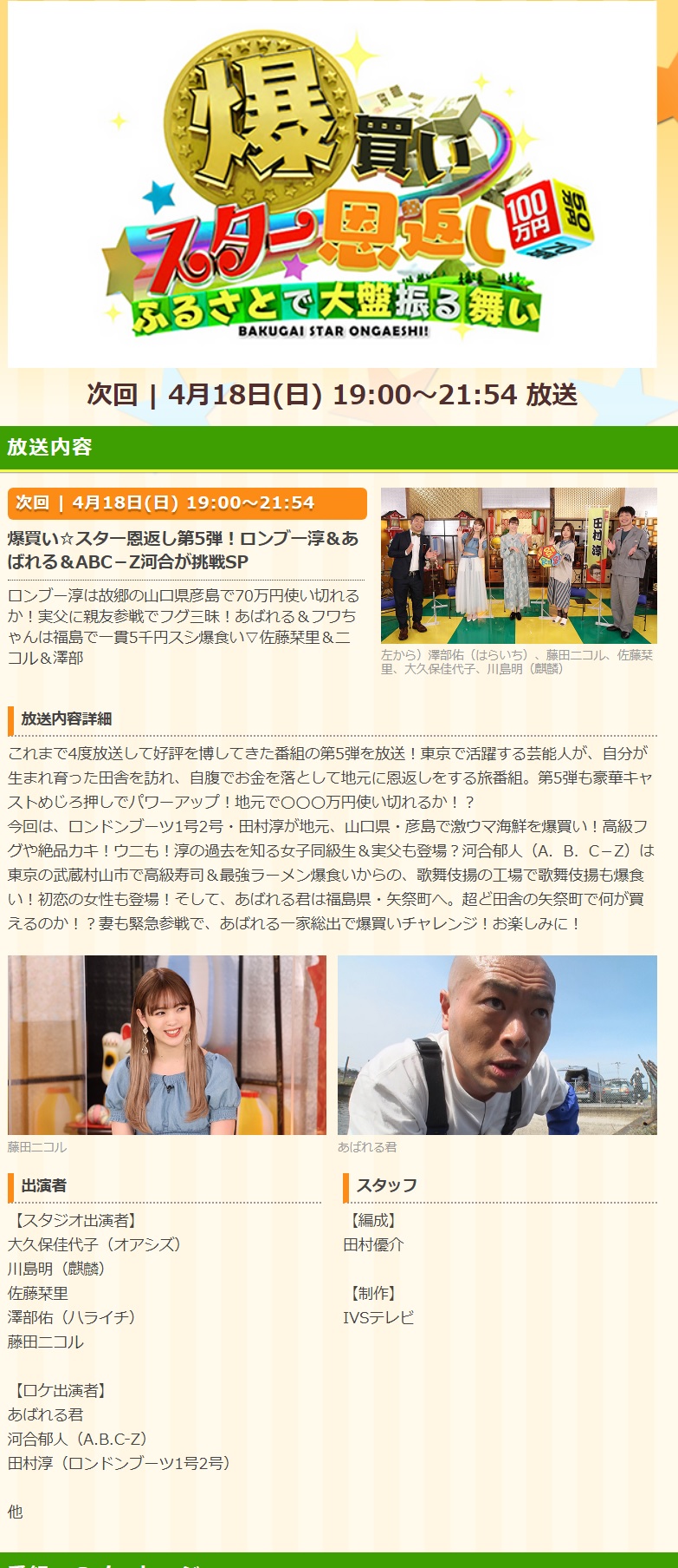 爆買い スター恩返し 2021.04.14 未分類 先日の爆買い スター恩返し 福島と山口ロケのON AIR が決まりました。 あばれる君と ロンドンブーツを撮影させて貰いました。 とても面白い番組になっております。ぜひご覧ください!!!
